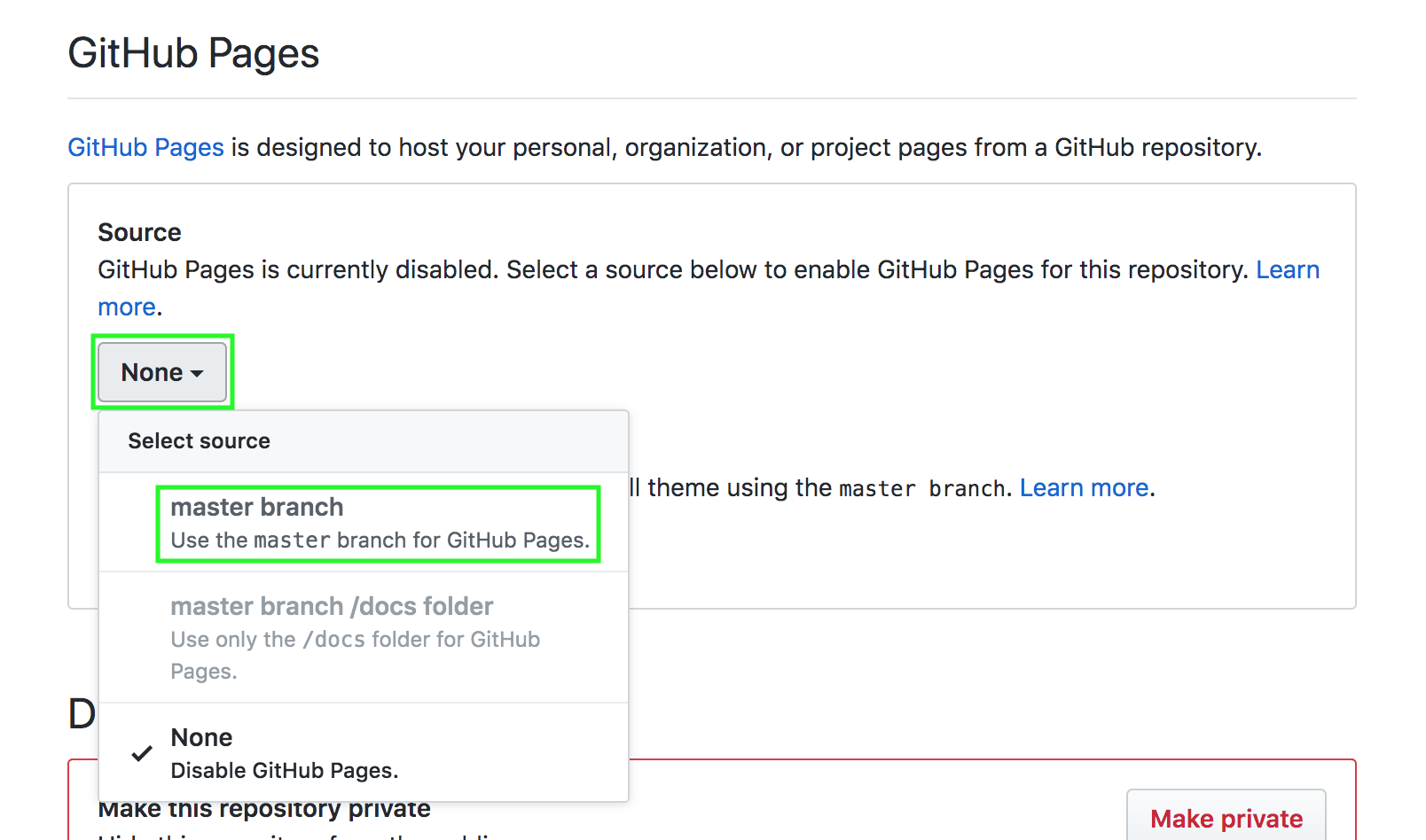 You want to go back to the settings page for your repo (the button with the at the top right of the page) since that’s where we’ll turn this collection of files into a website. Scroll down until you get to the GitHub Pages section Click the dropdown currently labeled “None” under the “Source” subheading, and choose “master branch” from the popup (highlighted in green below).6
