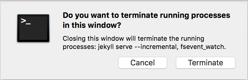 Once you’ve made a couple changes to see how it works, you might want to turn off the webserver and make lots of changes, then check out your handiwork. Or maybe you’re just done working on your website for now. Either way, it’s time to shut down the webserver. To do so, you can just close the terminal window, but you’ll get a warning like this.